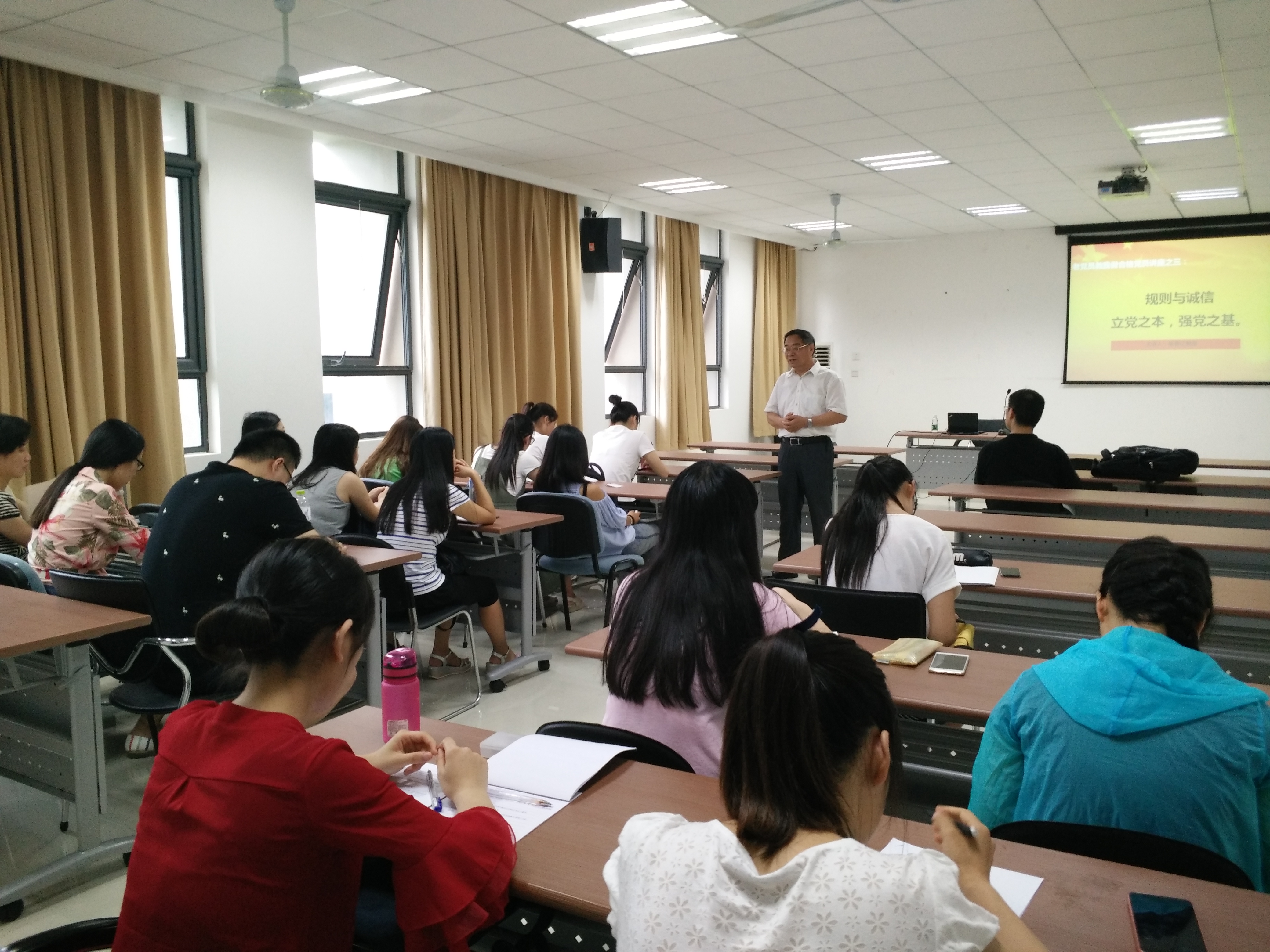 6月15日下午,“两学一做”学习教育之“老党员教我做合格党员”主题党课第三讲在模拟法庭举办,法学专业陈爱江教授为学院全体学生党员开讲。陈老师结合法学专业特色,从规则和诚信角度阐述党员的基本要求、自身素养和自我约束。