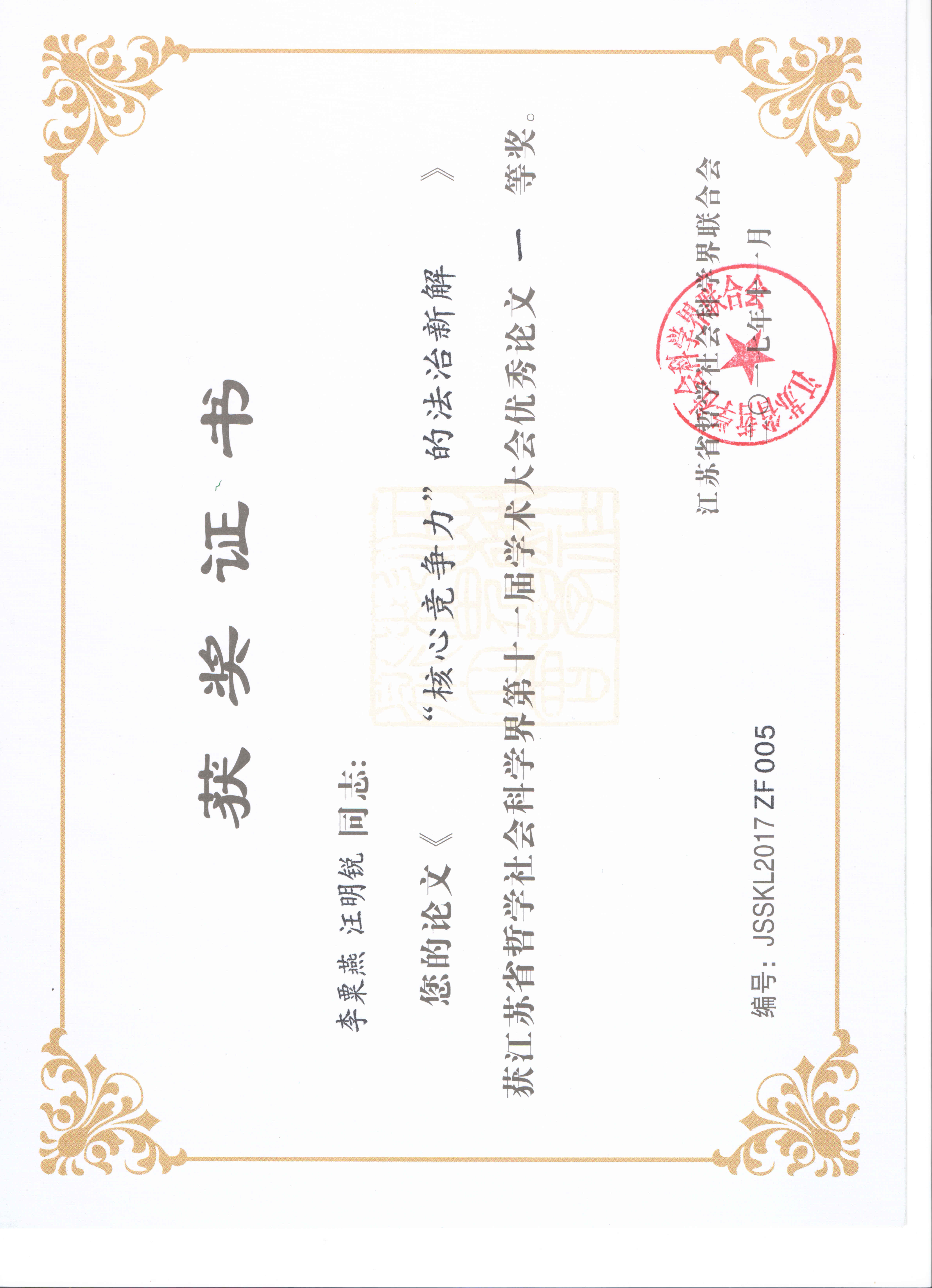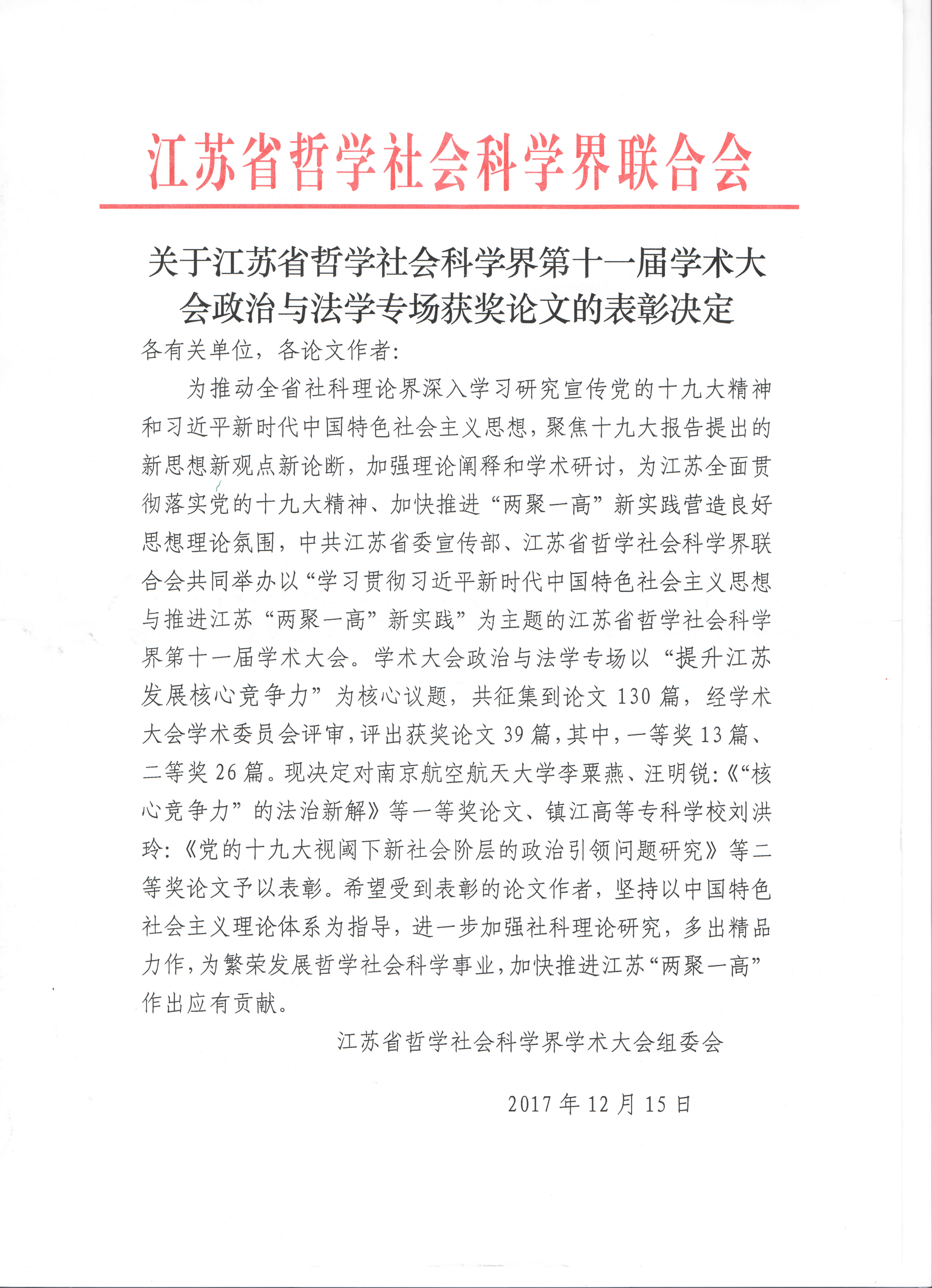 江苏省哲学社会科学界第十一届学术大会政治与法学专场的主题是“提升江苏发展核心竞争力”,来自省内外高校、党校、科研机构和法律实务界的代表100多人参加了政治与法学专场的会议,围绕这一主题展开热烈研讨。本次会议共征集论文130余篇,经学术委员会评审,评出获奖论文39篇,黄色导航 李栗燕教授与其研究生汪明锐同学合作的论文《“核心竞争力”的法治新解》荣获江苏省哲学社会科学界第十一届学术大会优秀论文一等奖,李栗燕教授应邀参加会议并在法学专场作了大会发言。