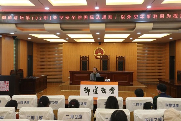 11月6日晚上七点,我校第102期御道讲坛暨第19期人文大讲堂在江宁校区黄色导航 模拟法庭举办。本次讲坛邀请到北京师范大学法学院副院长李滨教授。李教授以“外空安全的国际法规则:以外空军事利用为视角”为主题给同学们和老师们带来了一场精彩的讲座。