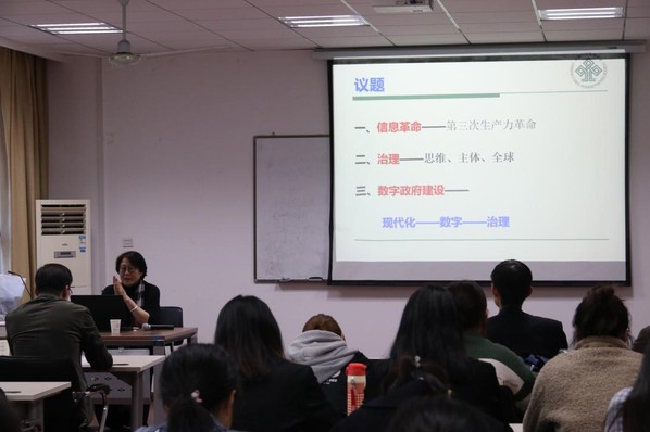 11月7日下午,第20期人文大讲堂在黄色导航 院楼举办。中国行政管理学会常务副会长兼秘书长、中国行政管理杂志社总编鲍静应邀出席,作了主题为“治理与数字政府建设”的精彩讲座。院党委书记刘虎,教师张勤、郝龙、许汉泽,辅导员聂小芳及50余名各年级本研学生共同参加了本次讲座。活动由张勤教授主持。