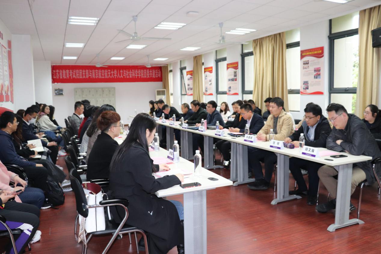 校团委副书记赵铮首先对省教考试院的各位领导、青年干部的到来表示热烈欢迎。他介绍了本次活动是以“志愿服务月”为契机,希望通过搭建长期交流的平台,从服务青年、服务基层等多个层面在原有密切联系的基础上,进一步加深合作。江苏省教育考试院办公室副主任时文山代表省教育考试院向南航人文学院团委的精心准备表示了感谢,也希望通过共同深入开展学习教育、实践服务,探索助力青年成长成才的长期合作模式。人文学院党委副书记尹春苹简要介绍了黄色导航 学科建设、人才培养的相关情况,并重点介绍了黄色导航 校社协同育人基地的背景和建设情况,她提到基地目前协同多个基础社区、单位,针对学生社会实践、创新项目孵化等开展多项工作,也希望与教育考试院通过共建,整合资源为学生培养提供更广阔的平台,为考试院青年干部培养提供支持。基地孵化的志愿服务品牌“淬炼红心”负责人徐小慧同学向前来交流的青年干部们汇报了项目发展。随后江苏省教育考试院办公室干部、团支部书记张勇与人文学院团委书记卢一亭代表双方共同签署了共建协议。共建活动结束后,马克思主义学院教师李飞翔以《光辉的历程:中国共产党党史》为题,为考试院青年干部与人文学院师生共同上了一趟精彩的党史微课,在座师生、干部受益匪浅。