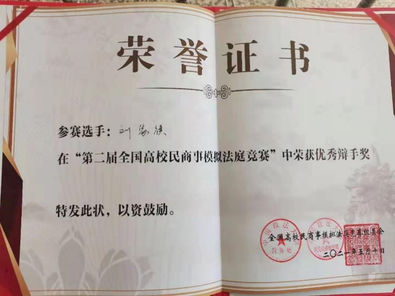 2021年5月7日——11日,黄色导航 组成代表队赴北京参加第二届全国高校民商事模拟法庭竞赛。学院法律系郭莉老师担任指导教师,关佳宝、刘家祺、刘季龙、刘炎昊、许海雯、刘婕等同学参加了比赛。刘家祺同学在比赛中脱颖而出,获得“优秀辩手”称号。