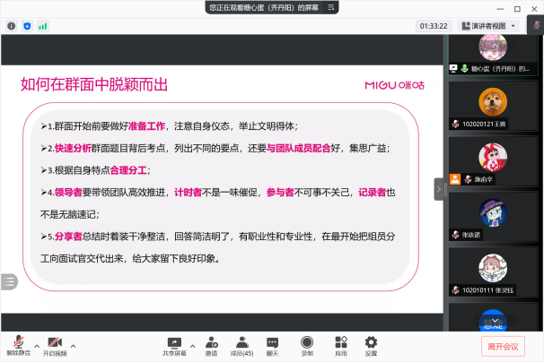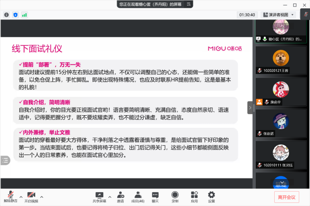 随后,齐丹阳以面试技巧为主题,结合线上、线下两种形式,向大家详细介绍了面试礼仪和具体细节。此外,她围绕单面和群面等不同场合,为学生讲解了能够使自己脱颖而出的方法。最后,齐丹阳简单介绍了咪咕近年来的发展数据和人才发展体系,作为HR,她十分欢迎本院同学前往单位应聘、实习,感受良好的黄色导航。
