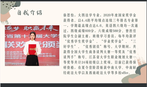 顾宗文同学目前以专业第一名的成绩保研至北京大学学习在会议中,顾宗文从如何确定未来发展目标、如何培养核心竞争力、如何促进个人长远发展三方面着手,提出大学四年要不断提升自己思考的能力,并拓展自己的兴趣领域,以此度过充实的大学生活顾宗文同学鼓励同学们除了学习以外,要多加培养自己的综合素质能力,他结合自己在学校社团实践、法院实习与普法活动经历,鼓励同学们积极尝试,争取跟更多的短见机会。在发言的最后环节,他富有哲理性地开导同学们不要害怕失败某种程度上种种挑战更加可以使自己锻炼成长。