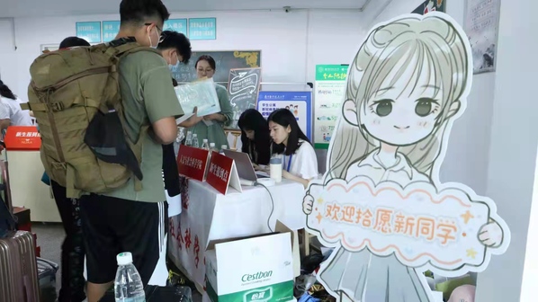 镜头回到迎新现场:6日上午,人文学院的志愿者们早早到达东区24栋迎新点,等候新生的到来。新生在到来的那一刻就感受到了学长学姐贴心周到的帮助——协助搬运行李、办理入住手续、拍摄“人文专属回忆”照片。为了迎接拾愿的新成员们,学院迎新小组还为新生们准备了萌点满满的辅导员人型立牌,各式精致小巧的手牌,专属礼品袋、定制门牌等等,力求让新生在新环境中也能获得归属感。烈日炎炎,迎新现场井然有序,志愿者们满腔热忱,一丝不苟地解决新生入校的每一个问题,新生们一张张青春洋溢的面庞,志愿者和工作人员忙碌的身影,都成为校园最美丽的瞬间。院党委副书记尹春苹来到迎新处,细致地了解了新生入学报到注册的情况,并对迎新处的师生表示了亲切的慰问,向志愿者的付出表示赞许与鼓励,并发放饮用水、面包和餐券等物品,让在场的志愿者们感受到浓浓的温暖。