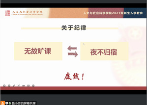 合格的大学生,在享受精彩丰富的大学生活同时,也有在大学中不能触碰的底线:夜不归宿、无故旷课等。本模块引导大一新生客观认识自我,充分了解学校各项规章制度,强调学生认真学习《学生手册》,让学生充分了解学校的规定办法。会议中穿插告诫学生年级事务注意事项、遇突发状况的处理方式等等,帮助学生拥有安心舒适的大学生活。