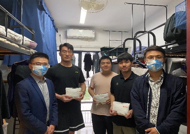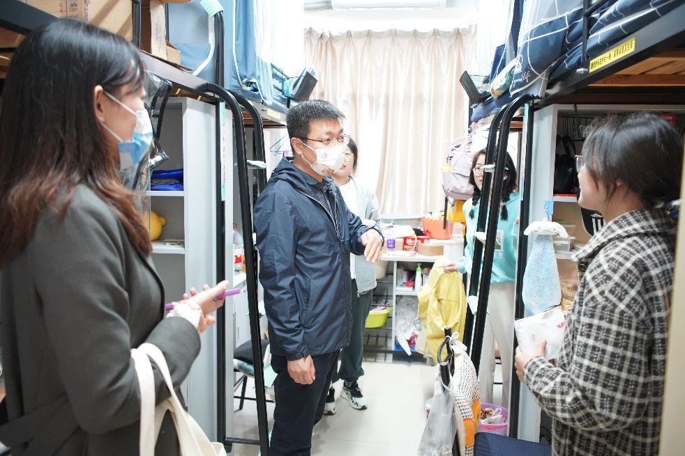学院以为师生办实事为宗旨定制了暖心口罩,希望师生们在疫情期间能感受到学院用心、贴心、细心、暖心的关爱。5月11日下午,院党委书记楚广兴,副院长施向峰、茅晓嵩,院长助理武小龙、聂明岩及专兼职辅导员深入学生宿舍走访,了解学生学习思想状态,并将学院定制的口罩暖心包送到学生手中。楚广兴表示,当前疫情防控形势依然严峻,希望同学们能积极配合学校做好核酸检测、信息摸排上报等各项防疫工作,共同筑牢校园疫情防控的安全防线。