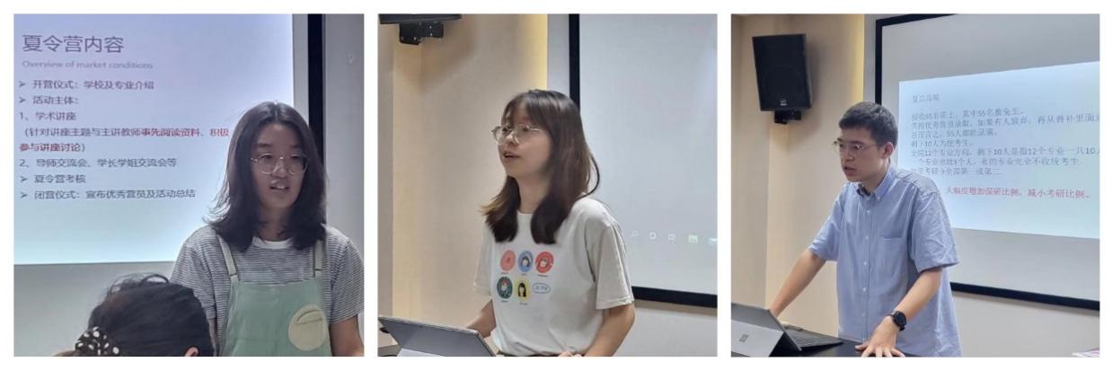 李宗宁结合自身经历介绍了保研夏令营中的相关注意事项。她鼓励同学们多阅读学术文献、做好材料准备,在专业课复习方面要抓提纲、抓关键、抓重点;刘珂分享了在准备过程中要摆平心态,准确定位自身,同时要有针对性地选择院校及专业;郭小凡提到在准备过程中心态占了很重要的成分,鼓励同学们以最佳的状态做好准备,同时要综合地域、导师、自身兴趣、就业等对学校和专业进行筛选,做出最佳的选择。