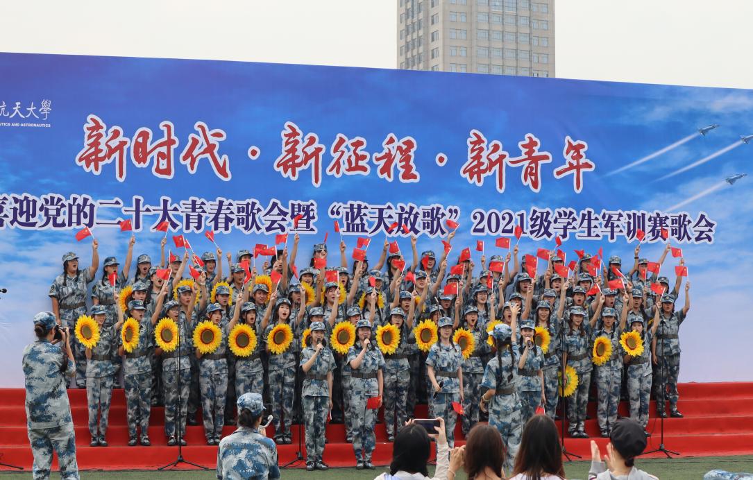 “蓝天放歌”赛歌会是每年军训不可缺少的一环。时间紧,任务重,从排练到登台只有两个晚上的排练时间。同学们的乐谱都标记上了密密麻麻的注意点,有不少同学都用手机录下来范唱,回宿舍再反复听、记忆。在老师和同学的共同努力下,人文、外院学院的学子们用一首《在灿烂的阳光下》献歌祖国,赛歌会现场爆发出阵阵掌声。