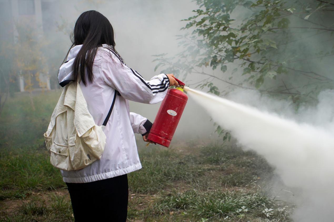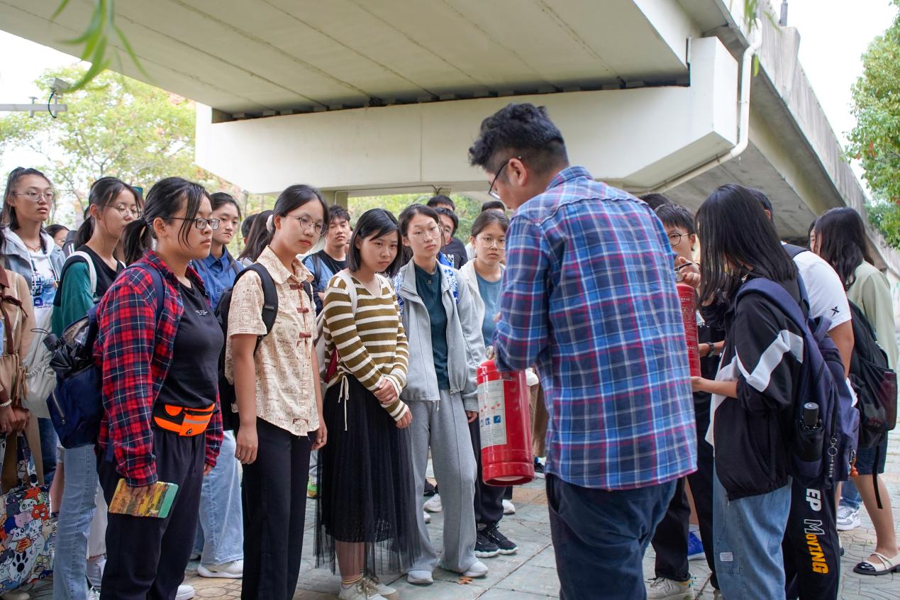 随后,在场师生有序前往和园35栋宿舍楼旁高架桥空地开展了消防安全实战演练。演练中,保卫处老师亲自示范了灭火器的正确使用方法,并邀请了几位同学进行实操,再次巩固了消防安全知识。
