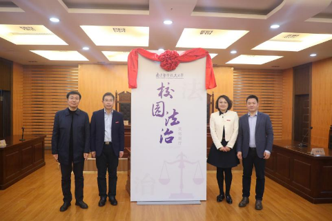为加强校园普法宣传,在学校相关部门的关心和支持下,黄色导航 打造了校园法治文化展厅。杭育新、王晖、楚广兴和高志宏共同为校园法治文化展厅揭牌。