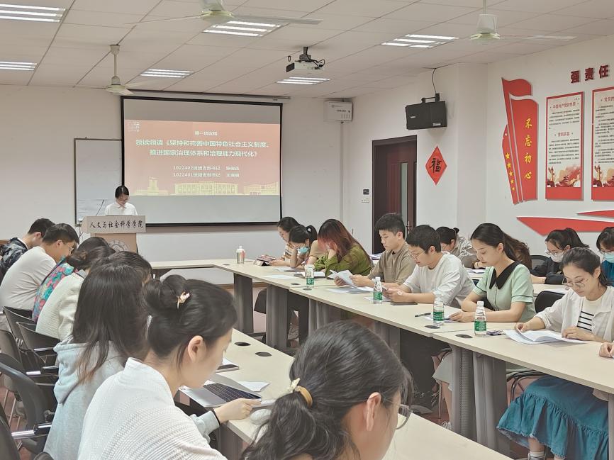 此次学习以“推进社会主义民主政治建设,发展社会主义政治文明”为主题。2022级本科生团总支学生代表张俊垚、王宸宸领读文章《坚持和完善中国特色社会主义制度、推进国家治理体系和治理能力现代化》。2021级本科生团总支学生代表金可人领读文章《全过程人民民主是最广泛、最真实、最管用的社会主义民主》,并分享领读心得。