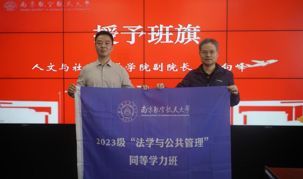 随后,施向峰为学员授予班旗,并寄托了对学员们以班级为依托、以南航为平台,学习向未来的殷切期待。李昕阳对同等学力硕士班的顺利开班表示祝贺,他充分肯定了南航优质的教学实力以及平台资源,并希望同学们学有所获,获得一段难忘的学习经历。
