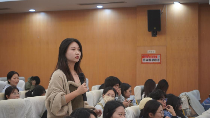 互动环节气氛热烈,鲍聪幽默风趣的回答引得现场师生掌声阵阵。他鼓励同学们跳出专业障碍思维,提升就业的软性能力,客观分析核心潜能以促进职业发展。