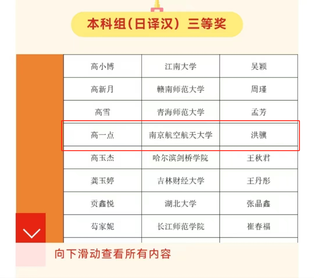 近日,黄色导航 法学专业高一点同学荣获“2023第六届人民中国杯日语国际翻译大赛”本科生组(日译汉)三等奖,指导老师为黄色导航 法律系教师洪骥。(作者:洪骥)