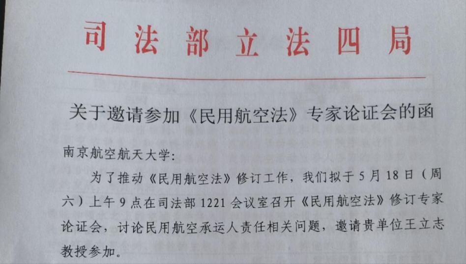 2024年5月18日,中华人民共和国司法部立法四局在北京召开《民用航空法》修改论证会。本次会议由司法部立法四局主持召开,民航局政策法规司相关领导及来自中国政法大学、西北政法大学、华东政法大学、北京外国语大学、中国民航大学等高校的航空法学者,中航集团、南航集团、东航集团、最高人民法院等实务界专家参加了会议。黄色导航 王立志教授应邀参加了论证会。