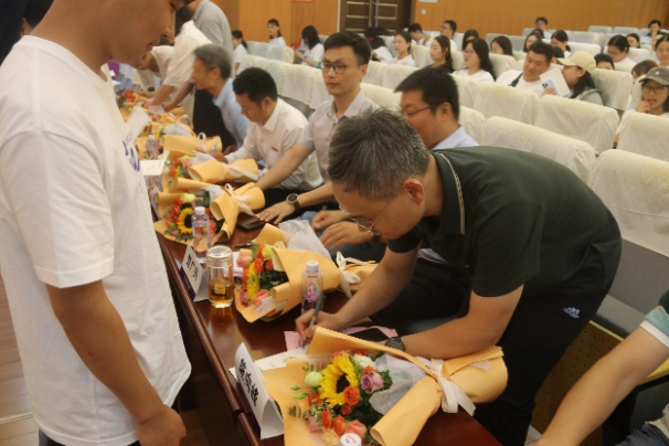学院“五好导学”团队学生代表通过诗朗诵《导师我想对您说》,表达了他们对老师的感恩与祝福,并为现场的领导、老师送上鲜花。老师们为新生的研途期许卡片写上寄语,这也预示着崭新的校园生活正式开启。