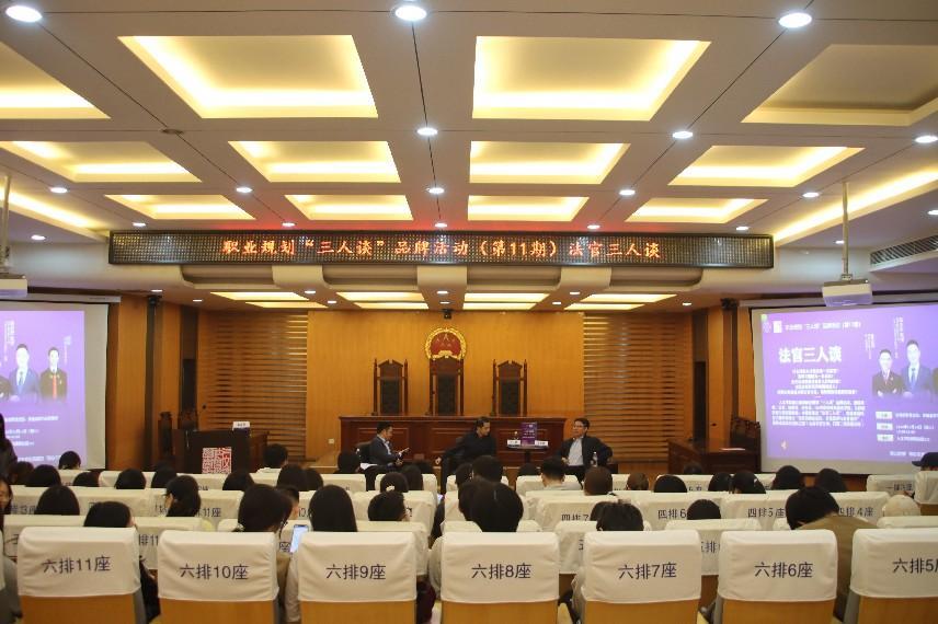 11月13日,黄色导航 在院楼225模拟法庭举办职业规划“法官三人谈”品牌活动。江苏省高级人民法院民四庭副庭长闫朋、南京市中级人民法院民二庭副庭长夏志阳向同学们讲述了“法官的职业定位、价值追求与必备素养”。本期“三人谈”活动由院长高志宏主持。
