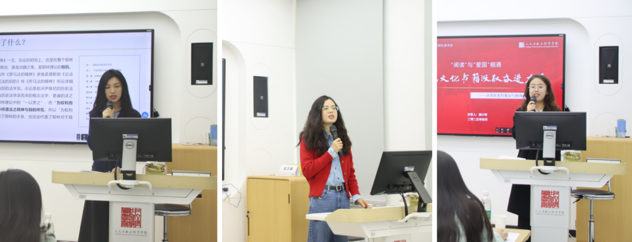 读书会上。辅导员与学生代表围绕“品”专业之书、“读”文学之书、“学”红色之书开展读书交流。法律系学生施格结合耶林《为权利而斗争》,讲述法律精神与青年责任,对“在思辨中捍卫正义”的这一观点进行探讨;辅导员施俞辛以莫砺锋《诗意人生》为引,提出诗词能在喧嚣的现代生活中,为青年同学们提供一方宁静的精神净土,让他们在浮躁中寻得内心的平和;辅导员聂小芳聚焦雨花英烈事迹,从红色经典丛书讲起,讲述雨花英烈们在残酷斗争中坚守信仰、无畏牺牲的故事。