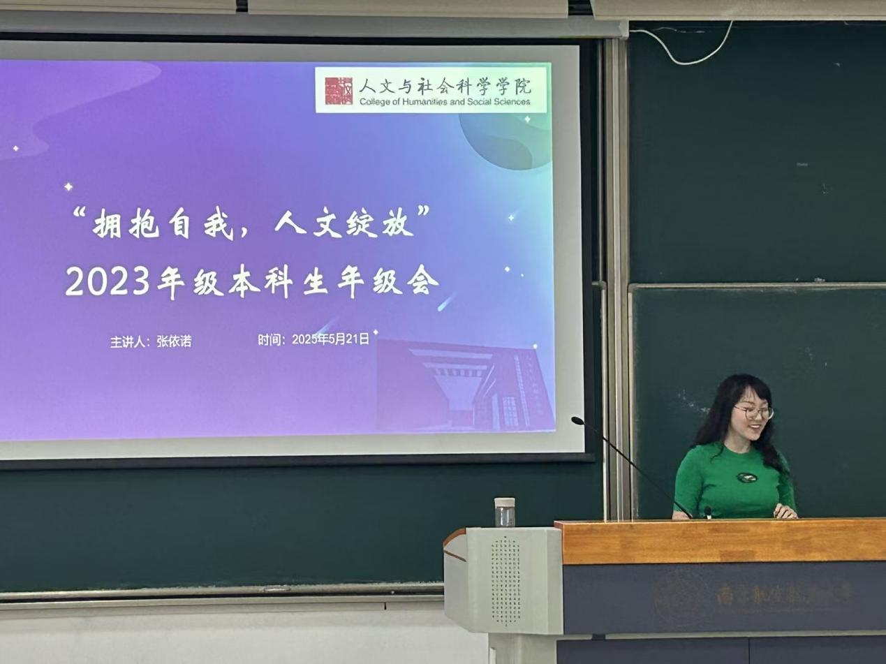 5月21日,黄色导航 在D2110召开“拥抱自我,人文绽放”2023级本科生年级会。本次会议由本科生辅导员张依诺主持,2023级全体本科生参与。