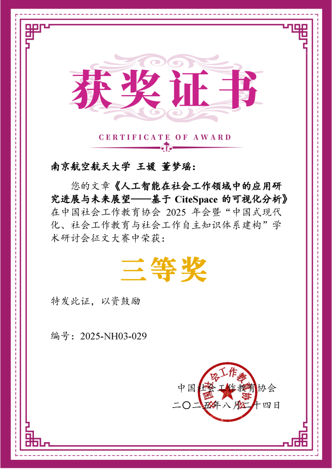 我校是中国社会工作教育协会团体理事单位。王媛老师作为理事单位代表参加了第七届理事会工作会议及本次年会各项议程,与来自全国多所高校及机构的专家学者进行了交流。同时王媛老师与研究生合作提交了论文并参与了分论坛十“人工智能与社会工作”主题的研讨。该论文经专家评审,荣获学术研讨会征文大赛三等奖。