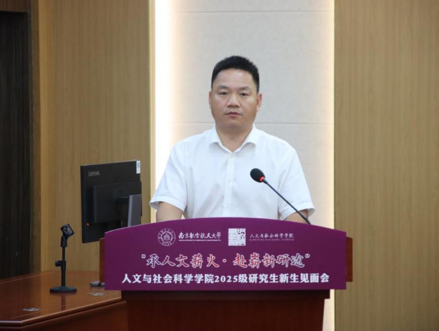 研工部副部长雷蕾向各位新同学的到来表示热烈欢迎。她强调,研究生阶段是知识深化、能力提升、思维碰撞的黄金时期,希望同学们能正确认识导学关系、同辈关系、小我与大我的关系,在青春奉献中彰显人生价值。她祝愿2025级新同学们在南航、在人文学院能不忘初心、坚守理想、收获成长。
