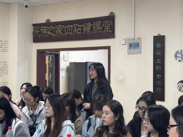 七家湾社区党委书记赵欣为同学们详细介绍了社区多民族融合的历史脉络与建设成果。在生动形象的56个民族书刻墙前,赵欣系统讲解了设计者袁茂林老师的设计理念与背后的文化故事。“我们希望通过这些可视化的载体,让生活在这里的各族居民,包括来访者,都能直观地感受到不同民族的文化魅力,从而增进民族认同感。”