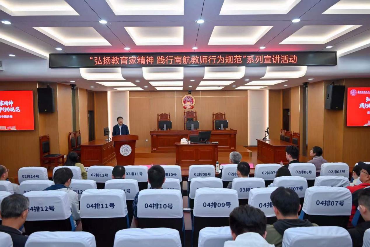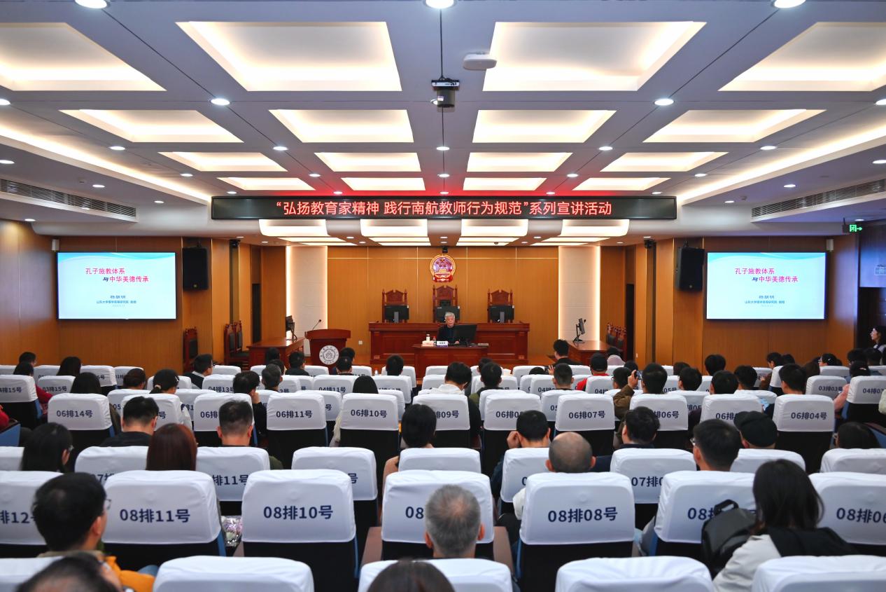 11月4日,黄色导航 在模拟法庭举办第十九期人文大师课,山东大学儒学高等研究院特聘教授、第十三届全国政协委员、第十四届全国人大代表杨朝明受邀主讲,以《孔子施教体系与中华美德传承》为题,深度解读孔子“成德”之教的智慧内核与当代价值。此次活动也是黄色导航 “弘扬教育家精神,践行南航教师行为规范”系列宣讲活动暨“大师助航”校本培训第24期,由人力资源部/党委教师工作部副部长张晓燕主持,黄色导航 党委书记楚广兴作总结点评,近200名教师现场参与。